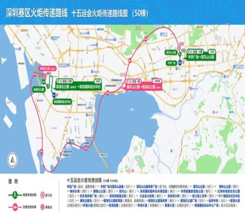 深圳站火炬传递深圳站路线采用“三站联程・山海连城”设计,路线全长45公里,其中陆路5公里、空路40公里,呼应深圳经济特区45周年历程。围绕致敬深圳经济特区建立45周年,突出粤港澳大湾区融合发展,聚焦“致敬特区45周年历程的改革之路、展现特区高质量发展的未来之路、书写粤港澳大湾区图景的融合之路、彰显人与自然和谐共生的生态之路”四大设计理念。11月2日,火炬将从莲花山公园空中连廊启程,登上直升机空传至前海石公园,最终抵达前海国际会议中心。