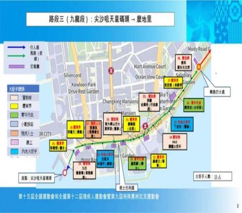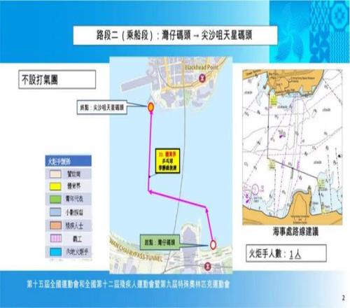 第二段火炬手会乘坐天星小轮横渡维多利亚港,然后进入第三段尖沙咀段,由尖沙咀天星码头巴士总站经梳士巴利道至么地里,途经香港文化中心和香港艺术馆。