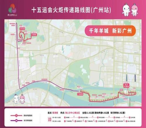 广州站火炬传递路线以“千年羊城 新彩广州”为主题,从传统中轴迈向新中轴,从城市起源图腾(五羊石像)到近代历史印记(海珠广场),从体育冠军摇篮(广东省二沙体育训练中心)到城市客厅(海心沙中心舞台),串联历史地标与现代风貌,展开一段从古代文明到近代革命、再到现代都市的历史叙事,展现“老城市新活力”的传承与创新,彰显广州在融湾向海的中国式现代化进程中排头兵、领头羊和火车头的使命担当。整个火炬传递路线共11.6公里,其中跑动传递4.8公里,无人驾驶车辆转场6.8公里。